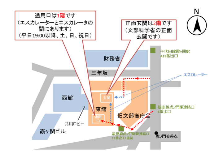 2/10の方は2階の正面玄関からお入り下さい。2/11(火・祝)は休日のため、正面玄関が閉まっていますので、1階の通用口からお入りください(下図参照)。