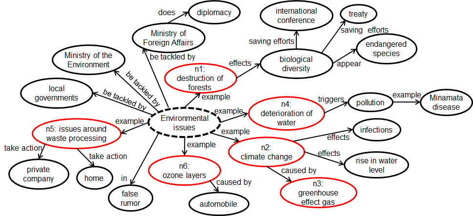This figure shows the concept map drawn by a participant for the environment topic. The node enclosed dotted line show the center node. The nodes enclosed red line with the same number show that the participant checked these nodes as having the same meaning..
