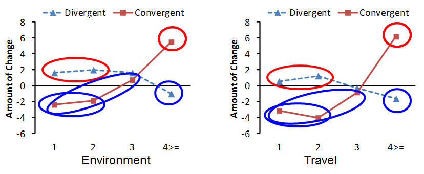These graphs show amount of change at distances 1, 2, 3 and 4 or more for the two topics in each scenario. We found significant differences between two scenarios. The amount of change at distance 1 and 2 in the divergent scenario were greater than those in the convergent scenario. The amount of change at distance 4 or more in the convergent scenario was greater than those in the divergent scenario. Differences also found among distances in the convergent scenario. The amount of change at distance 4 or more was greater than the other distances.