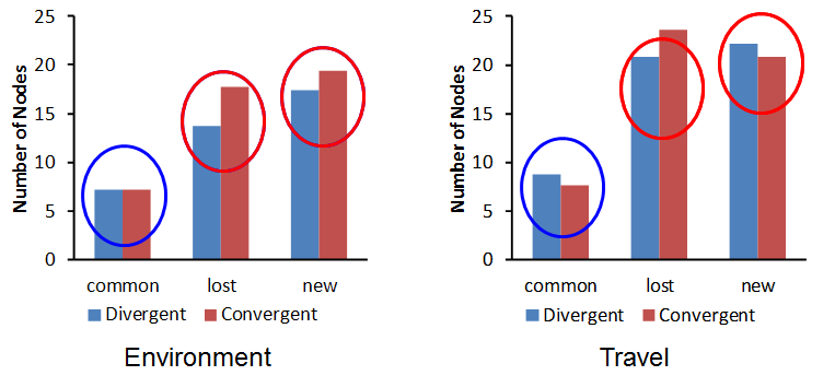 These graphs show the average number of common, lost and new nodes in each scenario of the two topics. Blue bar shows the divergent scenario and red bar shows the convergent scenario. We found significant differences among three types of node. The number of common nodes was less than the other two types of nodes. Regardless of the scenarios and topics, concept maps dynamically changed before and after searching. We also found significant differences between search topics. The number of lost and new nodes in travel topic was more than those in the environmental topic. These indicate that concept map in travel topic changed greater than those in environmental topic.