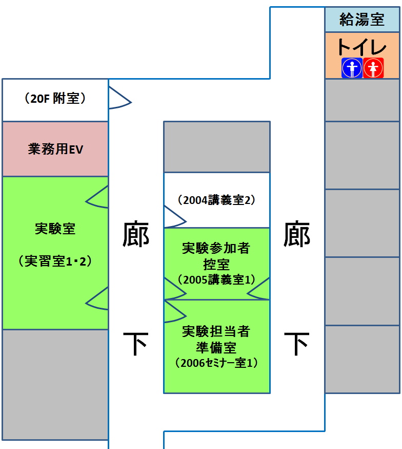 実験は、実験室(実習室A・B)にて行います。また、休憩などは実験参加者控室(2005講義室)を利用可能です。